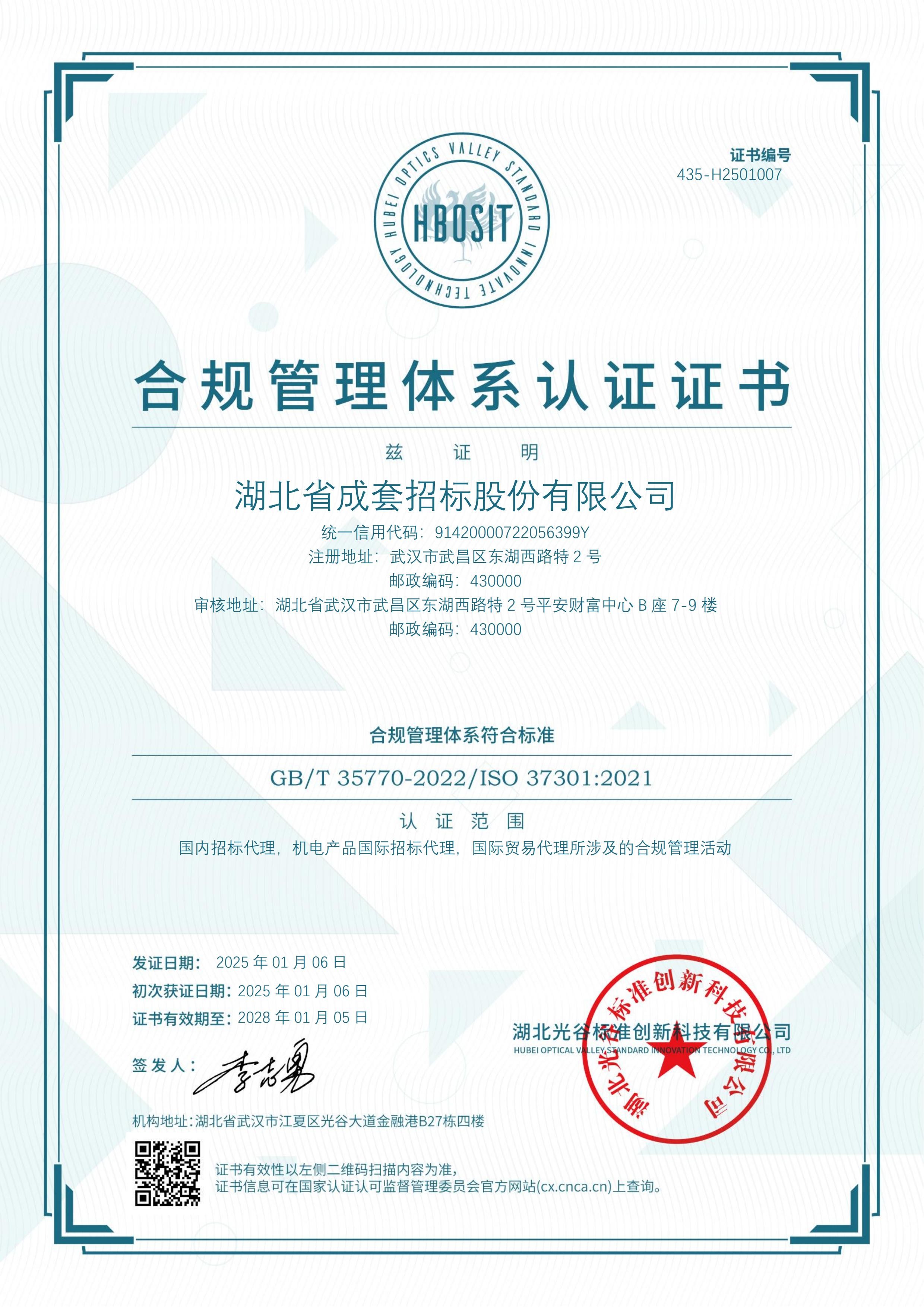 湖北省足球外围平台工程咨询有限公司合规管理体系认证证书