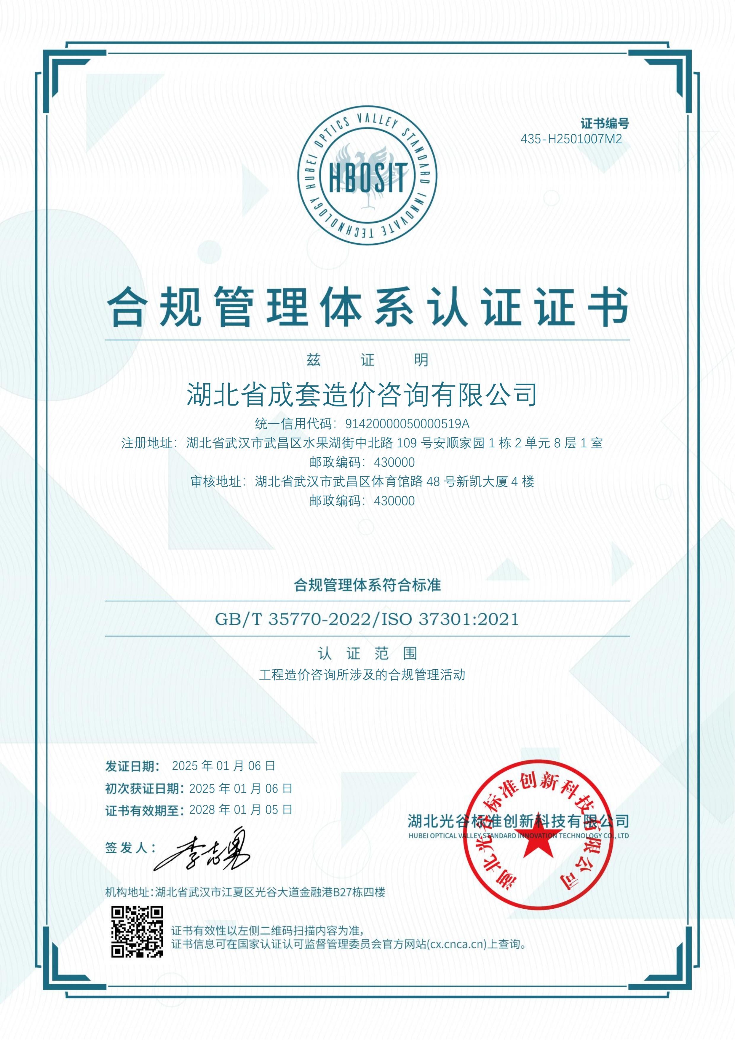湖北省足球外围平台造价咨询有限公司合规管理体系认证证书