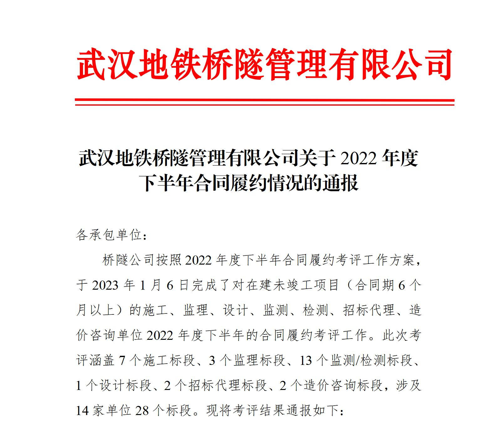 近日,在武汉地铁桥隧公司对2022年度招标代理单位合同履约情况的考评中,买足球外围平台推荐公司喜获优秀等次。