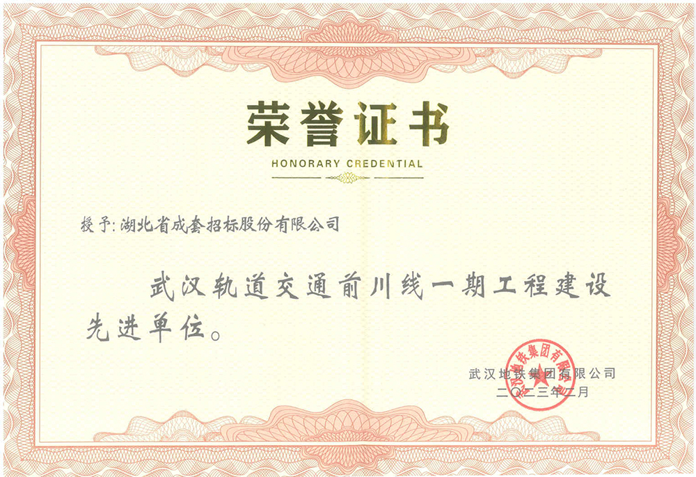 该荣誉代表了武汉地铁集团对公司多年招标代理服务的肯定,也是对公司在武汉市轨道交通项目招标过程中依法依规、优质高效和诚实守信工作作风的认可。自2019年以来,公司已连续3次获得武汉地铁集团授予的“先进单位”的荣誉称号。