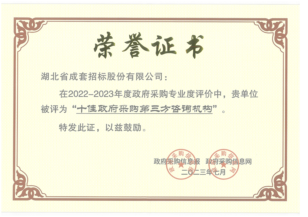 近日,在政府采购信息报、政府采购信息网联合主办的“2022-2023年度政府采购专业度评价”评选活动中,买足球外围平台推荐公司喜获政府采购领域最高荣誉“十佳政府采购代理机构”和“十佳政府采购第三方咨询机构”奖项。该奖项是对公司政府采购业务专业、优质、高效服务的高度认可。