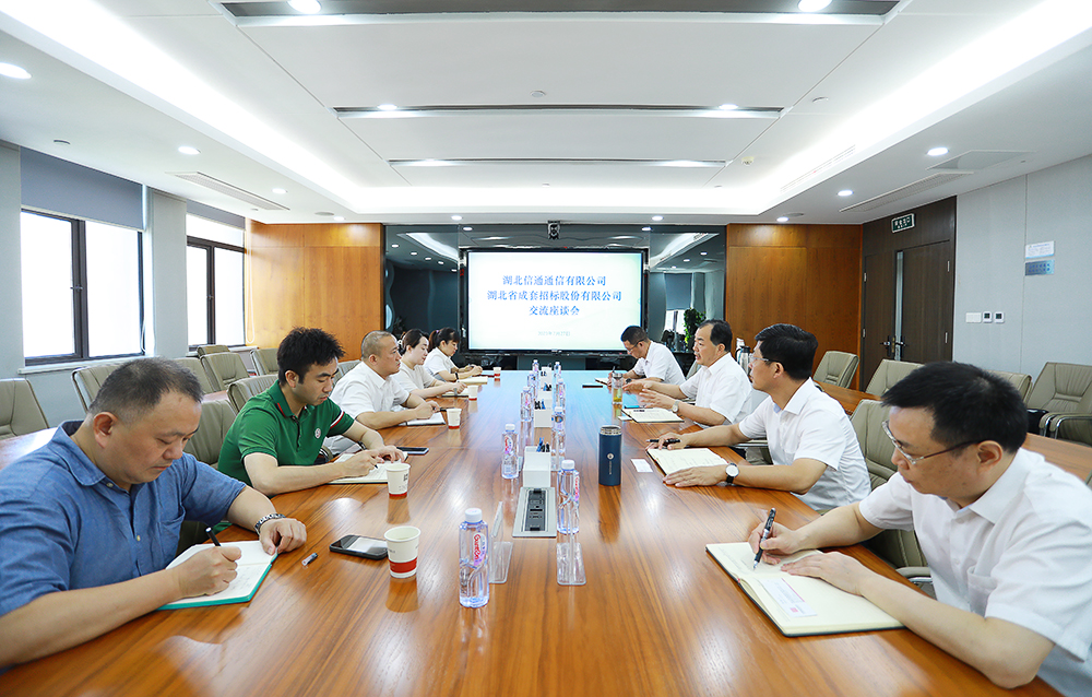 7月27日,湖北省信通通信有限公司招标部总经理徐勇等一行5人到买足球外围平台推荐公司调研座谈。公司党委书记、董事长黄泽旺,副总经理李启发出席会议并开展交流,相关职能部门负责人参加座谈。