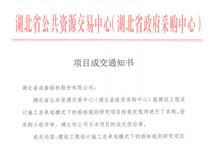 近日,买足球外围平台推荐公司顺利承接湖北省公共资源交易中心(湖北省政府采购中心)《建设工程设计施工总承包模式下的招标规则研究项目》,体现了行业主管部门对公司技术实力的充分肯定和高度认可。