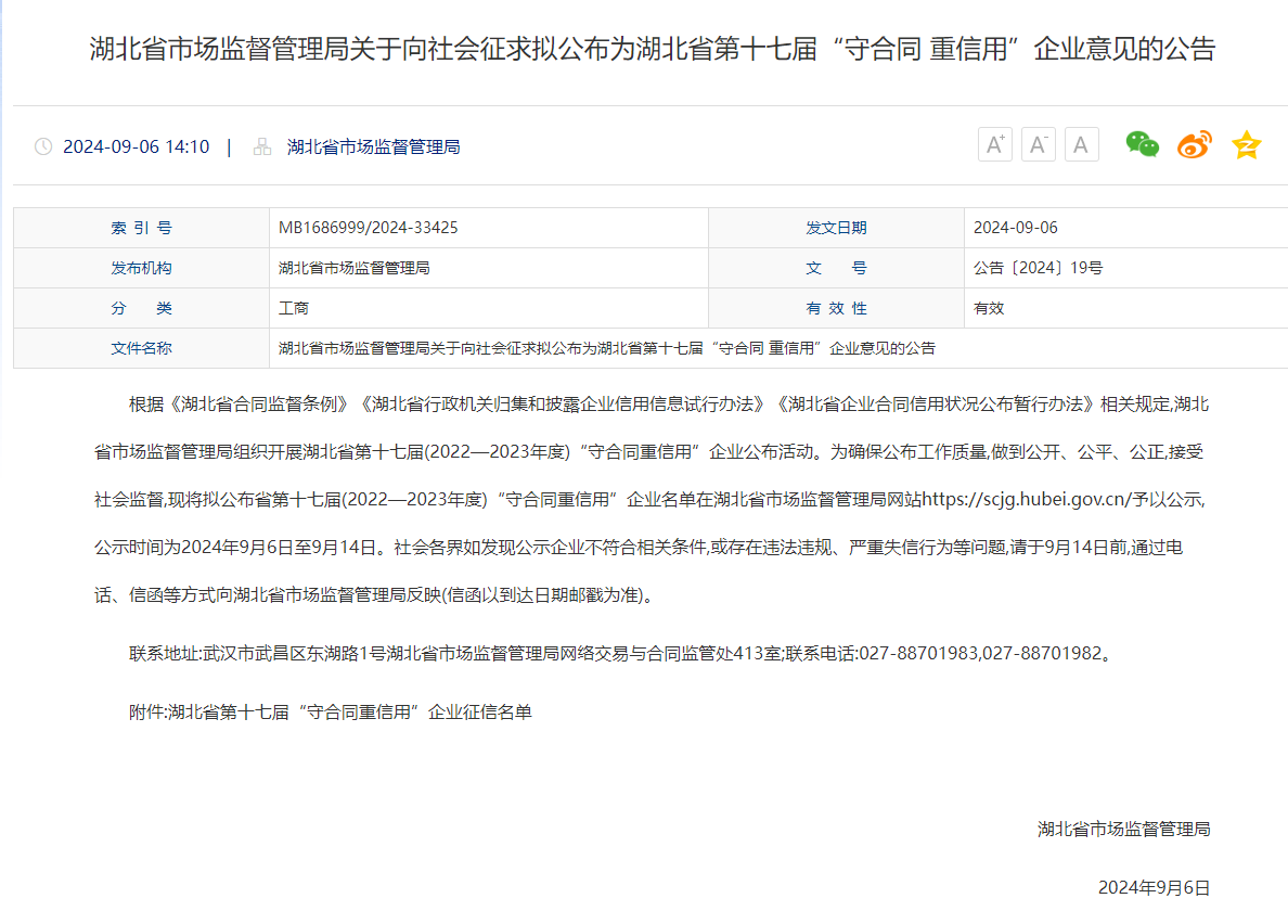 公司下属子公司湖北省买足球外围平台推荐造价咨询有限公司在此次评选中荣获2022—2023年度湖北省和武汉市“守合同重信用”企业称号。湖北省买足球外围平台推荐工程咨询有限公司荣获2022-2023年度武汉市“守合同重信用”企业称号。