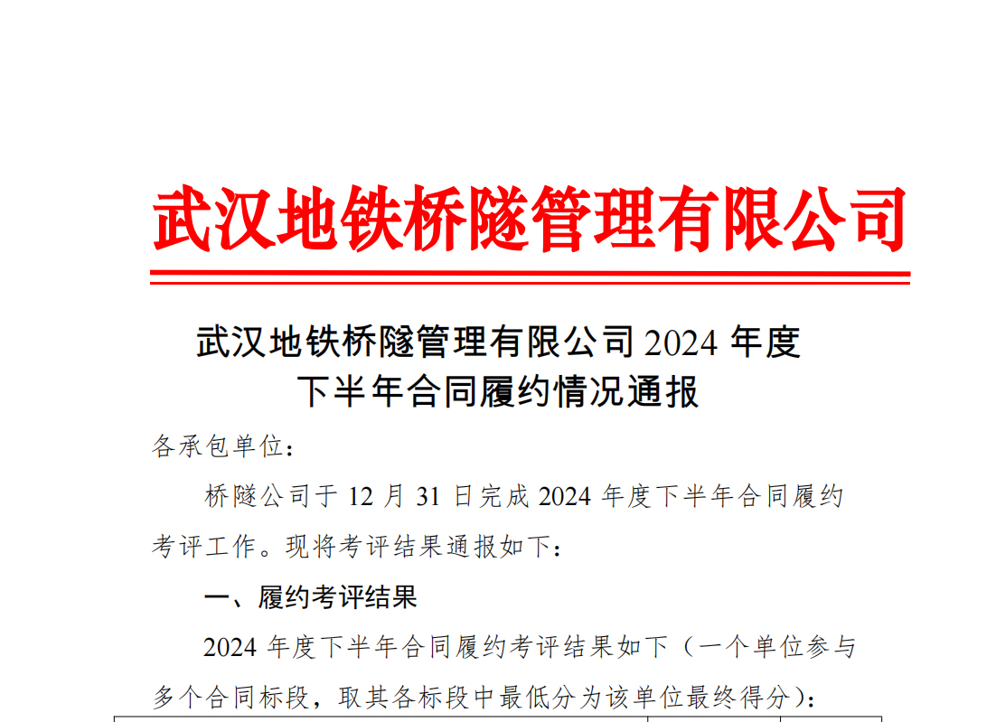 近日,武汉地铁桥隧公司公布2024年度招标代理单位合同履约情况考评结果,足球外围平台以高分通过考评,再次获得优秀等次。